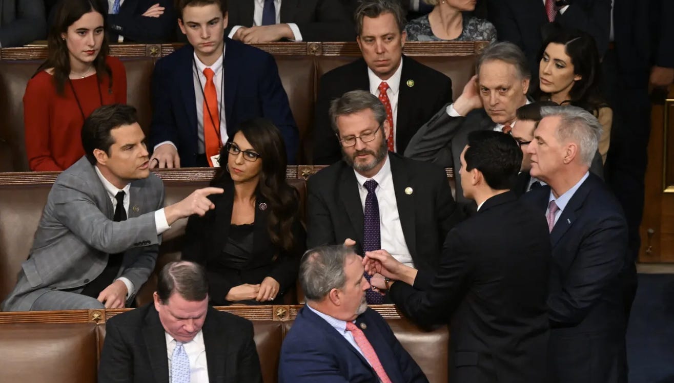Then Matt Gaetz happened. Matt Gaetz, unindicted sex offender, far-right troll, and avatar of Mike Judge’s “Beavis” character, found himself, sitting next to fellow publicity hound Lauren Boebert, as the center of the universe. The entire country has waiting on the edge of its chair for his vote. The deciding vote. Surely McCarthy wouldn’t have called a vote without nailing down the gentleman creep from Florida. Surely.