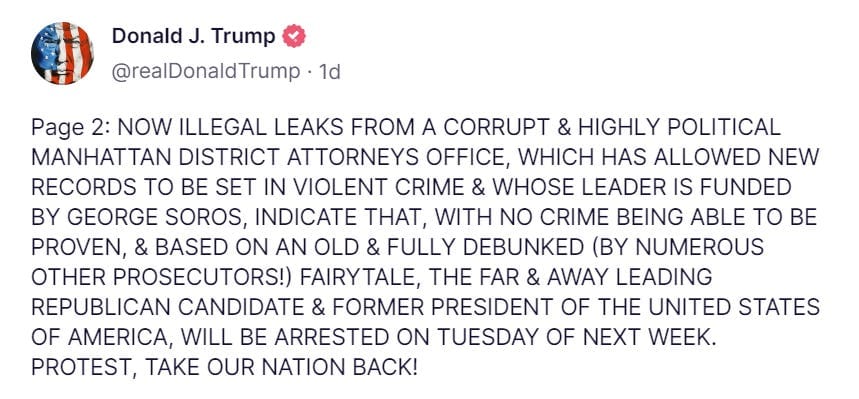 So, while the NY attorney’s office and the Secret Service are in, let’s just say, delicate negotiations over how to handle the spectacle of a former President being booked in a court of law (no perp walk, because it’s too easy for would-be assassins; no handcuffs, because what’s Trump going to do, choke someone?) no one seriously believes Trump will actually suffer any consequence from this — the charges in question, while absolutely criminal, are barely above the level of a misdemeanor, and even if convicted, the Secret Service will surely have something to say about the logistics of protecting Trump’s life in Rikers lockup. Meanwhile, Trump’s handlers, remaining attorneys, and Lindsey Graham are all gleefully saying that the spectacle itself will ensure Trump’s re-election.
