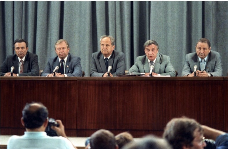 Five men appear, addressing a nervous country, as pictured. The leader, Vice President Gennady Yanayev, says Gorbachev is "resting" for "health reasons". Everything is normal. Obey orders.