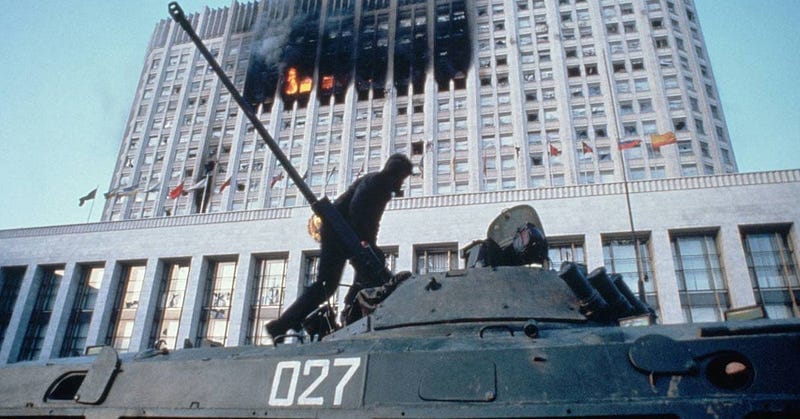 Yeltsin, faced with another coup led by the same group of people two years later, responded by shelling the Russian version of Congress - the very same building Yeltsin stood in front of, on top of a tank, and faced down the KGB and the Army - with tanks of his own.