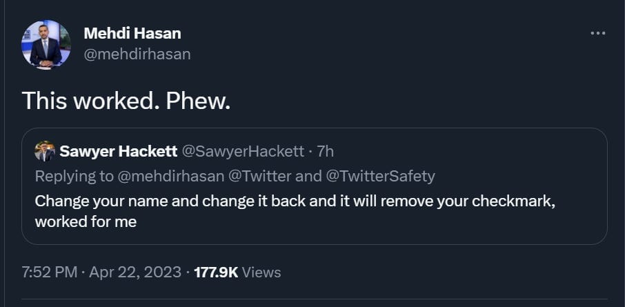 Word began to spread that you could lose the hated Blue Tick of Shame by changing your username (a “feature” Twitter introduced back when verified users were changing their names at random to mock Musk’s refusal to see the value of verified identities) and there was quickly relief among many.