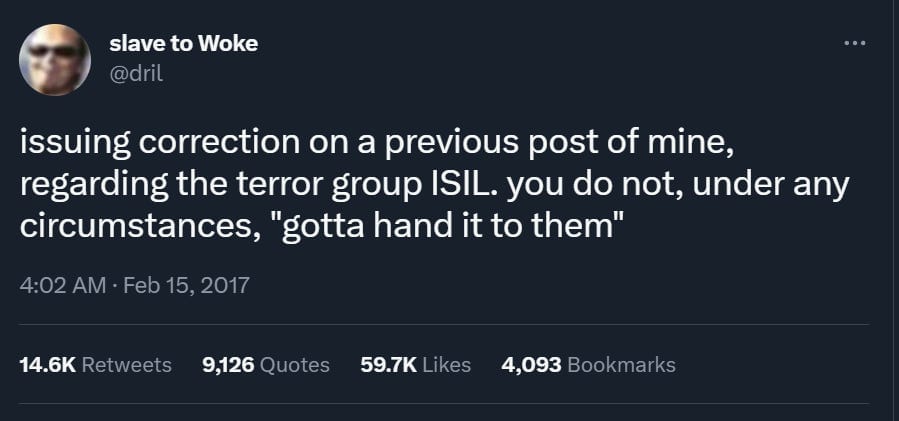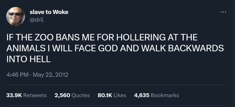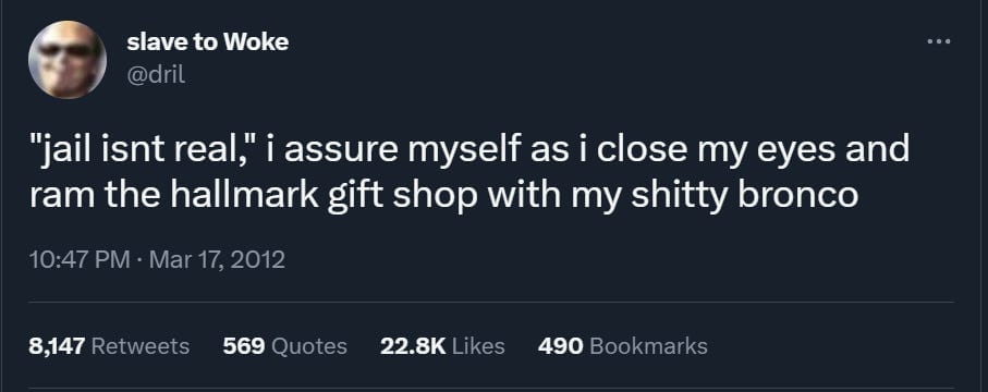 If you are not familiar with dril, he is essentially the personification of the humor of the web forum days of the 2000s migrating into the social media era of today. His first tweet was arguably the best tweet ever made: