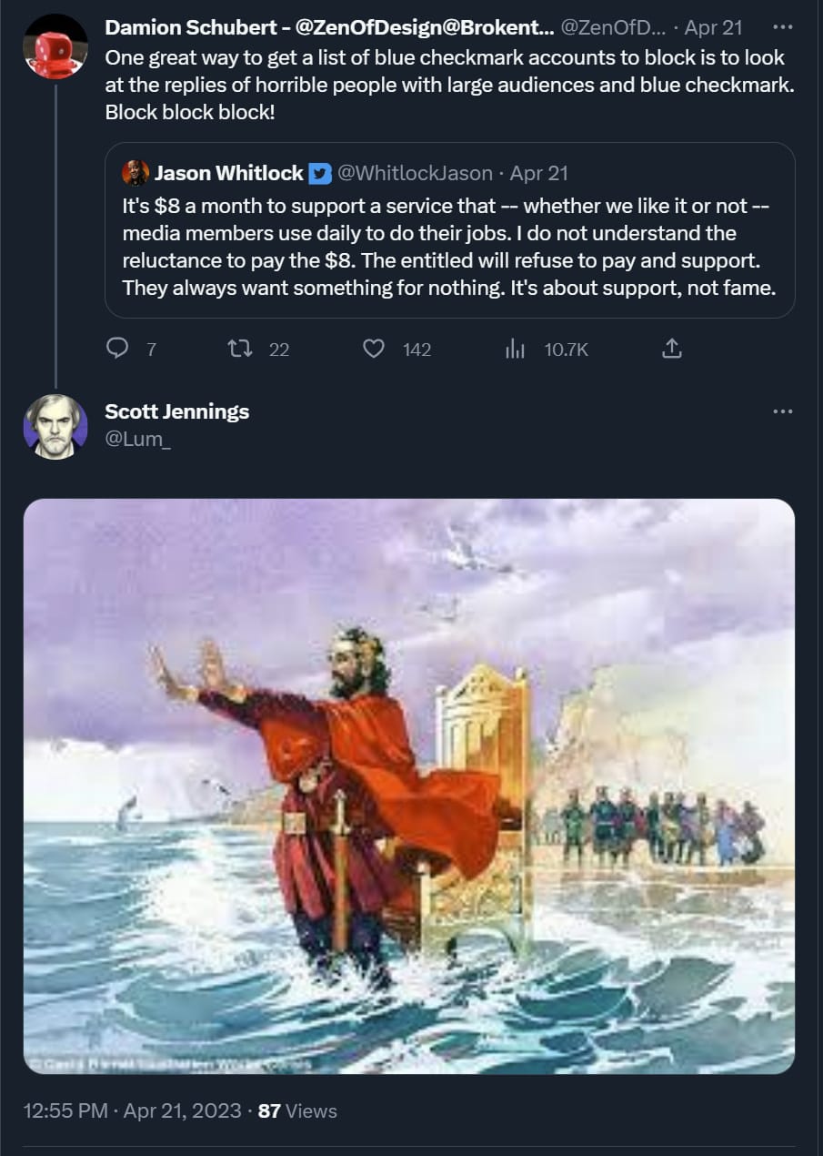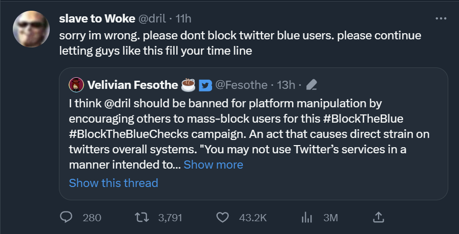 So a movement popped up to #BlockTheBlue - aka to block every Twitter Blue user since, well, just look. For the record, this was my initial reaction: