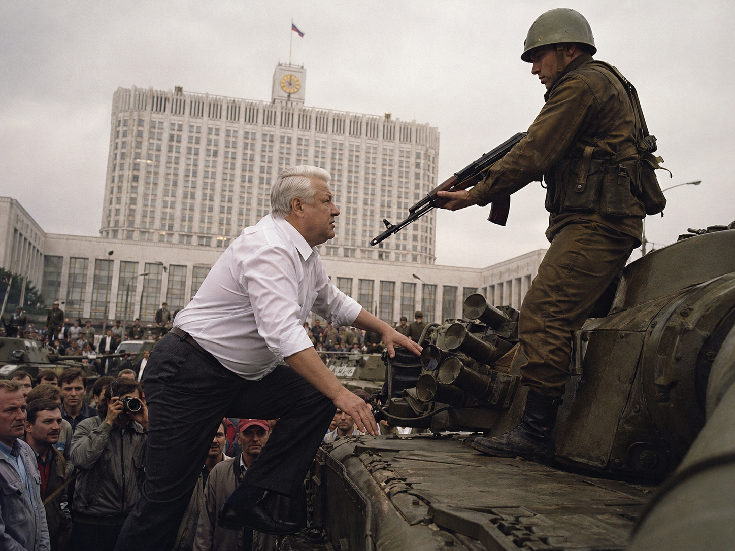 To the men of the so-called Emergency Committee, returning to Russian, he said: "I do not address you as a head of state, for I am not. I do not address you as a soldier, for I am not. I address you as a man and as a priest. I say to you: lay down what you have taken. Restore the lawful government of the Soviet Union. Return your soldiers to their barracks. Open the prisons you have filled. There is yet time. Tomorrow there may not be. As priest I tell you: the door of repentance is, by the mercy of God, never quite closed, but only the foolish man assumes that it shall remain open at his convenience. Do not be foolish men."