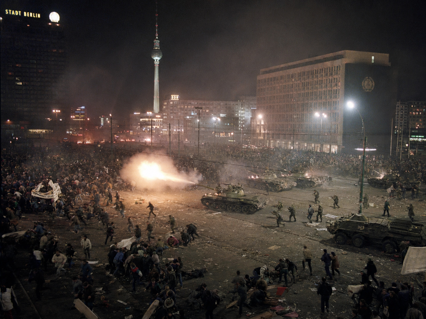 In Warsaw, on the underground frequencies of Solidarity, the address was rebroadcast in full, in Polish, three times before midnight. In East Berlin, where the Soviet jamming of Western radio had collapsed with the regime in the previous 24 hours, RIAS broadcast the German passages on continuous loop. In Moscow, on the BBC Russian Service and the Voice of America, the Russian passages were broadcast clear, the jamming of Soviet authorities having, on this evening, also faltered.