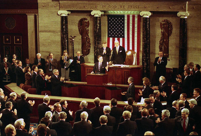 The Senate, convening at 9 a.m. and adjourning shortly after 6 p.m., adopted Senate Joint Resolution 173 by a vote of 96 to 4. The House of Representatives, sitting in continuous session from 10 a.m. through the early evening, passed the identical measure 410 to 18. The President, in the East Room of the White House at 8:45 p.m., signed the bill into law in the presence of the Cabinet, the leadership of both houses, the Joint Chiefs of Staff, and the family of Lt. Cmdr. Robert E. Pennington, the senior of the two F-14 aviators missing over Esfahan since Friday and confirmed today, by a Pentagon spokesman, to be in Soviet custody.