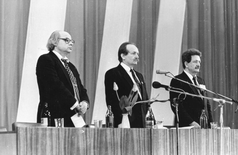 The Rukh congress, attended by approximately 1,100 delegates from across the republic, elected the poet Ivan Drach as its chairman and the journalist and former political prisoner Vyacheslav Chornovil as the chairman of its Lviv organization. It adopted by acclamation a program demanding the immediate restoration of Mr. Gorbachev to office in Moscow; the convocation of a sovereign Ukrainian Constituent Assembly; the recognition of the Ukrainian Greek Catholic Church, suppressed since 1946; the prosecution of those responsible for the Famine of 1932-33 and for the disposal of contaminated material from the Chernobyl disaster of 1986; and the unconditional withdrawal of all Soviet armed forces from the territory of Iran. The blue and yellow flag of the short-lived Ukrainian People's Republic of 1918, banned for seventy-one years in this city, flew over the opera house through the proceedings.
