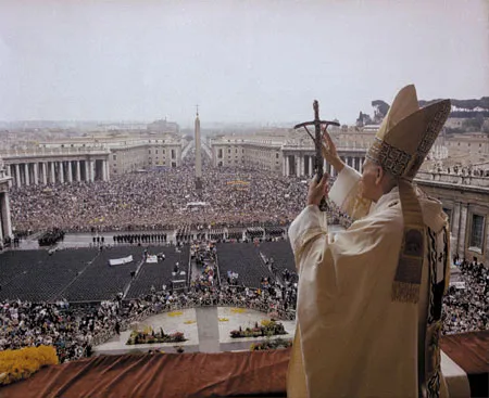 The Holy Father, who appeared visibly aged by the events of the past eight days and who spoke for forty-one minutes in five languages — Italian, Polish, German, Russian, and English — opened with the words with which he had opened his pontificate eleven years ago: Nie lekajcie sie! "Be not afraid!" The crowd in the square, which had been silent in the heat of the late Roman afternoon, took up the words after him, in Polish, and chanted them for nearly a minute before he could continue.