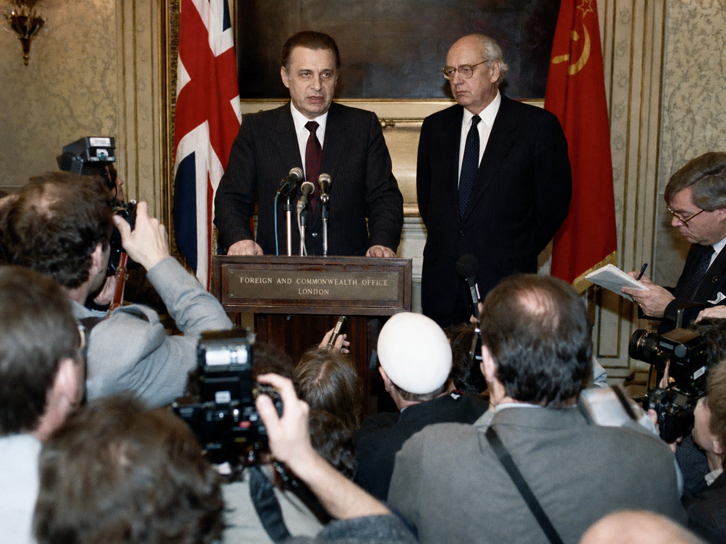 LONDON — Aleksandr A. Bessmertnykh, the Foreign Minister of the Soviet Union, appeared in the late afternoon today at a podium in the Locarno Suite of the British Foreign and Commonwealth Office on King Charles Street, in the company of the British Foreign Secretary, Sir Geoffrey Howe, and in the presence of an assemblage of foreign correspondents whose advance notice of the event had been measured in minutes, and confirmed in person, in his fluent English, what the world had through the day suspected and what the Soviet Union itself had not yet been told: that he had departed Moscow in the early hours of June 26 by means and through routes upon which he declined to elaborate; that he had reached the territory of the United Kingdom in the early hours of this morning by way of an undisclosed friendly capital; that he had requested and received the political asylum of Her Majesty's Government; that he repudiated the so-called State Committee for the State of Emergency in the U.S.S.R. as an unconstitutional and criminal organization; that he recognized as the lawful President of the Soviet Union Mikhail Sergeyevich Gorbachev, "wherever he may at this hour be detained, and in whatever condition"; and that he had with him documents, observations, and accounts of which he proposed to make public, in the next three quarters of an hour, "a portion proportionate to the gravity of the moment, and the welfare of those whose lives remain in danger."