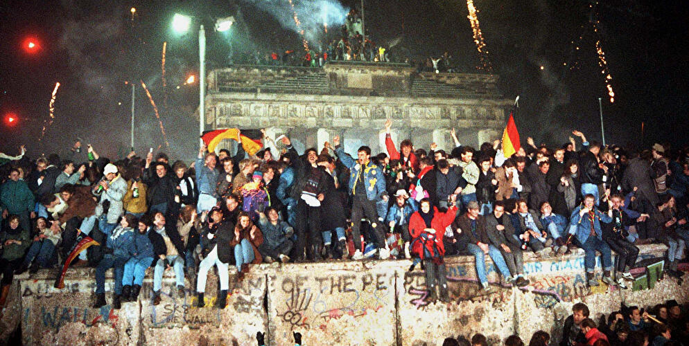 In Berlin, fallen this day after twenty-eight years, the population of the western half of the city — three of whose Allied garrisons had surrendered in the early morning — gathered through the day at the Brandenburg Gate, at Checkpoint Charlie, at Wittenbergplatz, in the great squares of the divided city, in numbers and in silence that defied description.